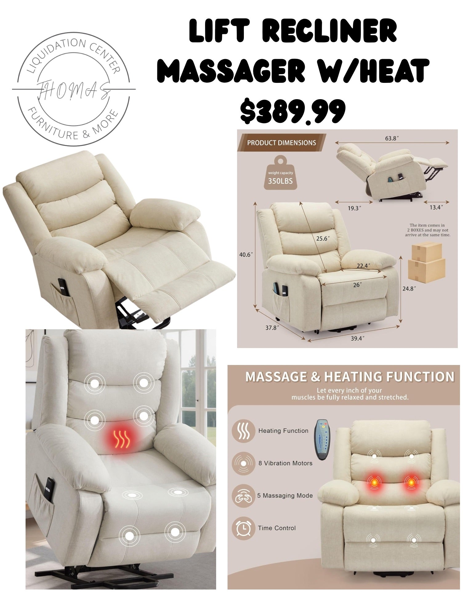 Lift recliner chair with massager & heat electric. Free shipping in the US